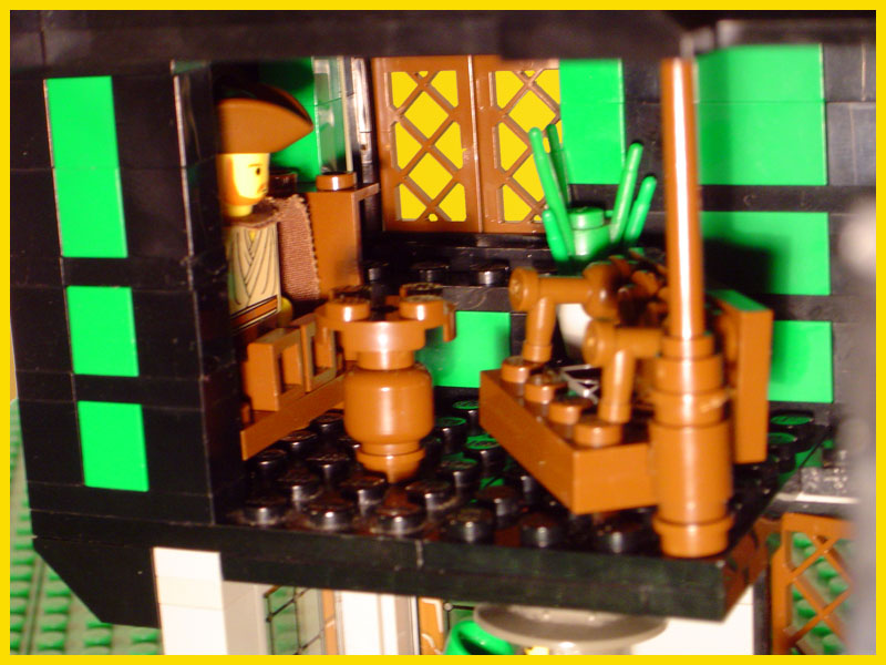 Small Bank I started this model as a bank, but hey guess what it ended up as a Starbucks. (And No, I know I'm not the first to do a Medieval Lego Starbucks). I originally started this after reading a very good article on using hinges to get odd angles. The windows to the rear are from a Harry Potter set, proving again although Harry Potter is rubbish in my opinion, he has led to some good LEGO elements. The window ledge in the fourth photo is using SNOT. The front wall is hinged and does open but all the interior shots were fuzzy so I binned them. I will retake them when I have time (probably never get done then). I had trouble with the hinged front and the roof slope so rebuilt the roof and the front now hinges open under the eaves.